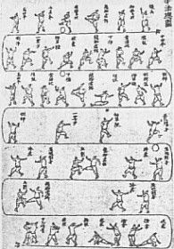 For some time afterwards Taekwondo and other martial arts enjoyed renewed popularity by both the military and general populace. In 1790 King Chongjo commissioned the printing of a martial arts textbook whose 4th chapter entitled "Hand Fighting Techniques" contained illustrations of 38 motions that closely resemble techniques and stances of today's Taekwondo. Illustration from "Hand Fighting Techniques" Towards the end of the Chosun dynasty Taekwondo (Subak) again lost some of its popularity mainly with the royal court. It is believed this was due to feuding and power struggles between the royal houses which required them to devote greater time to political matters. However, Taekwondo still remained a popular recreational past-time among the general populace. |